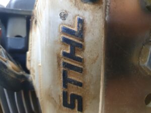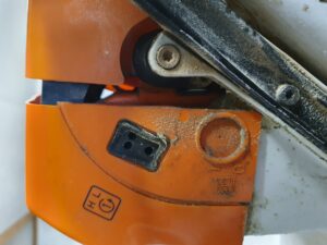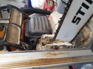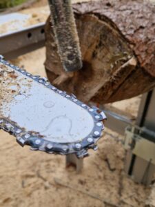”Det finns olika lösningar att köpa för vattenkylning men efter lite sökande på nätet fann jag något som lämpade sig för min verksamhet. Jag har avloppsrör med enkel skruvöppning för att lätt fylla på vatten. En avstängningskran för att reglera flödet som går via ett kopparrör med vinkelkoppling strax ovanför sågsvärd och sågkedja”, se video: