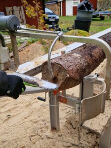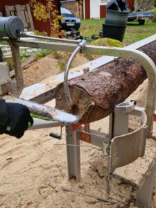 ”Självklart är det inte konkurrensmässigt att såga eget virke vid ett manuellt sågverk typ Logosol F2 som jag använder , men känslan av att såga eget virke är större än bara priset. För min del då jag var yrkesaktiv önskade jag få lägga tid på egen sågning och att utveckla tekniken med att hantera och såga självständigt.”